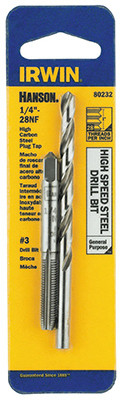 1/4" x 28, National Fine Thread, Tap & Drill Set, Carbon Steel, Ideal For Routine Maintenance, Repair Work & For Rethreading Where High Accuracy & Tolerance Thread Is Not Critical, Straight Flutes Are Ground To Provide Rapid Chip Removal For Efficient Threading, Designed For Hand Threading Work In A Variety Of Materials Taps Produce A Class 2B Thread, Includes #3 Drill Bit. vendor ID: 2864 Price/Unit: 6.29EA model: 80232