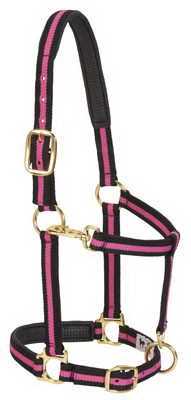 1", Black With Pink Stripe, Average Horse/Yearling Draft, Padded Adjustable Chin & Throat Snap Halter, Soft, PVC Coated Foam Rubber Padding Cushions The Nose & Crown Of This 1" Polypropylene Halter For Added Comfort, Brass Plated Hardware. vendor ID: 14860 Price/Unit: 15.99EA model: 35-7735-PK