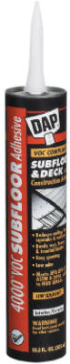 Dap 4000, 10.3 OZ, Subfloor & Deck Construction Adhesive, Premium Grade, Weatherproof, Reduces Nail Requirements, Floor Squeaks & Nail Pops, Forms A Permanent Bond On Wet, Frozen & Treated Lumber, Easy Gunning, Interior/Exterior Use, Meets APA AFG-01, ASTM Specification D 3498, Conforms To HUD UM-60, Not Available To Members In VOC Restricted Areas, Members Can Purchase TV #161-228. vendor ID: 29520 Price/Unit: 2.49EA model: 25028