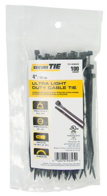 100 Pack, 4", UV Black, Ultra Light Duty, Cable Tie, 18 LB Tensile Strength. vendor ID: 17467 Price/Unit: 1.99EA model: CT4-18100UVB