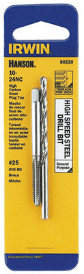 #10 x 24, National Course Thread, Tap & Drill Set, Carbon Steel, Ideal For Routine Maintenance, Repair Work & For Rethreading Where High Accuracy & Tolerance Thread Is Not Critical, Straight Flutes Are Ground To Provide Rapid Chip Removal For Efficient Threading, Designed For Hand Threading Work In A Variety Of Materials Taps Produce A Class 2B Thread, Includes #25 Drill Bit. vendor ID: 2864 Price/Unit: 4.99EA model: 80220
