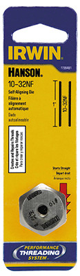 #10 x 32, National Fine, Self Aligning 1" Hex Die, Carbon Steel, Performance Threading System Threads Straight Every Turn, More Steel At Critical Points For Extra Strength, Ideal For Routine Maintenance, Repair Work & For Rethreading, Use With Performance Threading System Die Stock For Best Performance, Die Can Also Be Used With A Wrench Or Socket When Space Is Limited, Designed For Hand Threading Work In A Variety Of Materials. vendor ID: 2864 Price/Unit: 6.89EA model: 1799481
