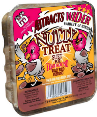 11.75 OZ, Nutty Treat Suet Cake, Complete Meal Of Rendered Beef Suet, Corn, White Millet, Roasted Peanuts, Oats & Milk, Readily Eaten Year Round By Both Suet & Seed Eating Birds & Wild Birds, Allergen Statement, Product May Contain 1 Or All Of The Following Allergens: Milk, Tree Nuts, Fish & Shellfish. vendor ID: 41483 Price/Unit: 1.49EA model: 12559