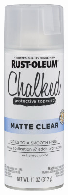 11 OZ, Clear, Chalked Ultra Matte Top Coat Spray, Create An Ultra Matte Finish With Excellent Coverage & Adhesion On Furniture & Home Decor, Provides 1 Coat Coverage On Most Surfaces Without Special Surface Preparation Or Priming, Can Be Painted Or Distressed, Giving The Project A One Of A Kind Look, Suitable For Use On Wood, Metal, Ceramic, Glass, Canvas & More, Not For Use On Galvanized Metal, Sandable. vendor ID: 38950 Price/Unit: 6.99EA model: 302599