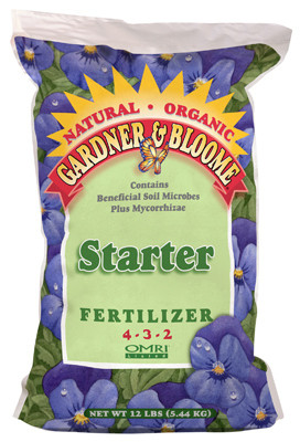 Gardner & Bloome, 12 LB, 4-3-2, Starter Fertilizer, Ideal For Tender New Transplants, Especially Pony Packs & 4" Container Plants, Helps Increase Transplant Success, Made From 100% Natural & Organic Ingredients With Quick Released Nutrients For Great Results, Feeds For Several Months, OMRI Listed. vendor ID: 7026 Price/Unit: 17.99EA model: 8639