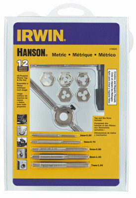 12 Piece, Metric Tap & Hex Die Set, Dies Are Ideal For Routine Maintenance, Repair Work & For Rethreading Where High Accuracy & Tolerance Thread Is Not Critical, Taps Have Straight Flutes Which Are Ground To Provide Rapid Chip Removal For Efficient Threading, Designed For Hand Threading Work In A Variety Of Materials Taps Produce A Class 2B Thread, Includes 3 mm-0.50, 4 mm-0.70, 5 mm-0.80, 6 mm-1.00, 7 mm-1.00 Plug Tap & 5/8" Hex Die, Plain Die Stock For 5/8" Hex Dies & T-Handle Tap Wrench For Taps No. 0 - 1/4". vendor ID: 2864 Price/Unit: 31.99EA model: 1765541