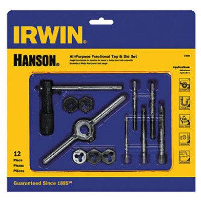 12 Piece, SAE Machine Screw Fractional Tap & Hex Die Set, Dies Are Ideal For Routine Maintenance, Repair Work & For Rethreading Where High Accuracy & Tolerance Thread Is Not Critical, Taps Have Straight Flutes Which Are Ground To Provide Rapid Chip Removal For Efficient Threading, Designed For Hand Threading Work In A Variety Of Materials Taps Produce A Class 2B Thread, Contains: Mach Screw 6 x 32NC, 8 x 32NC, 10 x 24NC, 10 x 32NF Taps & Dies, Fractional 1/4" x 20NC Tap & Die, Plain Die Stock For 5/8" Hex Dies, T-Handle Tap Wrench For Taps #0 - 1/4". vendor ID: 2864 Price/Unit: 31.99EA model: 24605