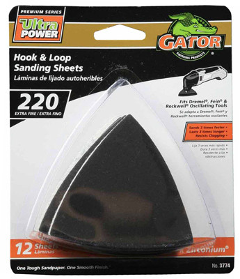 Gator, 12 Pack, 3", 220 Grit, Hook & Loop Sandpaper, Quick Change Hook & Loop Holding System Allows For Faster Sheet Changes, Resin Bonded To Resist Heat & Humidity For Longer Life, Refill For Oscillating Tool, Fits Master Mechanic, Dremel, Fein & Rockwell Oscillating Tools. vendor ID: 98244 Price/Unit: 4.49EA model: 3774