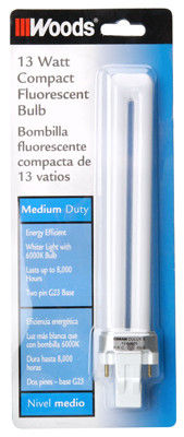 Woods, 13W, Fluorescent PL Bulb, G23 Base, 2 Pin, Equivalent To 60W Incandescent Bulb, 6000K Temperature Rating, 825 Lumens, For Use In Woods Fluorescent Handheld Task Lit, TV #210-487, Energy Saving. vendor ID: 2043 Price/Unit: 4.99EA model: 2502