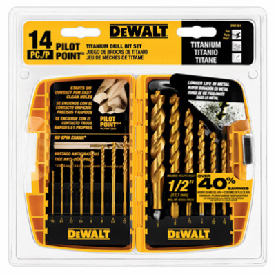 14 Piece, Titanium Pilot Point Drill Bit Set, Patented Pilot Point Tip Starts On Contact, Titanium Coating For Longer Life, 2 Each Size 1/8", 1 Each Of The Following: 1/16", 5/64", 3/32", 7/64", 9/64", 5/32", 3/16", 7/32", 1/4", 5/16", 3/8" & 1/2", Tough Case Container. vendor ID: 22426 Price/Unit: 25.99EA model: DW1354