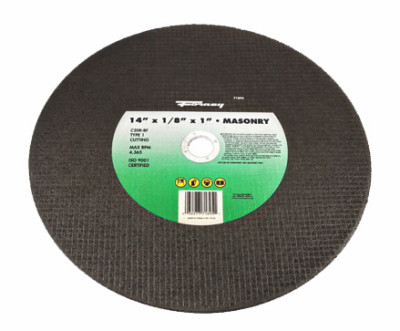 14" x 1/8", Masonry/Asphalt, Type 1, Cutting Wheel, 1" Arbor, Silicon Carbide & Dual Fiberglass Reinforced, Used Primarily On Ceramic, Masonry, Plastic & Other Non Ferrous Materials, Quality Made To Provide Fast, Safe, Dependable Service, Designed To Be Used On Stationary Saw Machines Only. vendor ID: 13649 Price/Unit: 9.99EA model: 71895