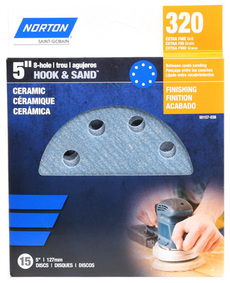 Norton, 15 Pack, 5", 320 Grit, 8 Hole, Premium Hook & Loop, Ceramic Sanding Discs, For Use On 5" Random Orbit Sanders, For Use On Wood, Metal, Fiberglass & Painted Surfaces, Premium Ceramic Grains Sands Cooler, Cuts Faster & Lasts Longer, Up To 5 Times Longer Than Traditional Sanding Discs, Anti-Clog Stearate Coating Reduces Particle Build Up, Keeping The High Performance Grain Exposed Longer. vendor ID: 98244 Price/Unit: 14.99EA model: 50157-038