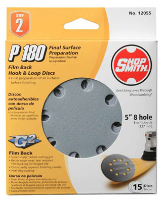 Shopsmith, 15 Pack, 5", 8 Hole, 180 Grit, Premium Hook & Loop Sanding Disc, Made With Film Backing & Premium Grain, Resins, & Anti-Clog Coating To Last 4 Times Longer Than Traditional Sanding Discs, For Use On Wood, Metal, Fiberglass, & Painted Surfaces. vendor ID: 98244 Price/Unit: 14.99EA model: 12055