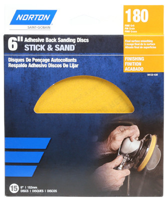 Norton, 15 Pack, 6", 180 Grit, Gold, Aluminum Oxide, Dual Action, Sanding Disc, Use On 6" Air Sanders, For Use On Wood, Metal, Fiberglass & Painted Surfaces, Anti-Clog Stearate Coating Reduces Particle Build Up, Keeping The High Performance Grain Exposed Longer. vendor ID: 98244 Price/Unit: 9.99EA model: 50132-038