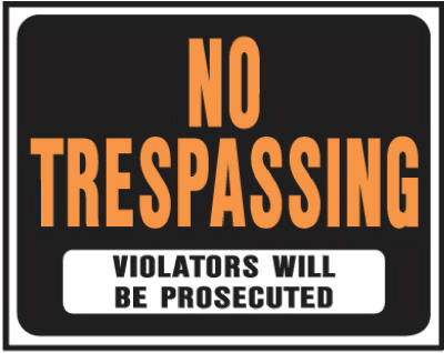 15" x 19", Jumbo, Plastic No Trespassing Sign, Hy-Glo Orange & Black On White. vendor ID: 49601 Price/Unit: 3.79EA model: SP-104