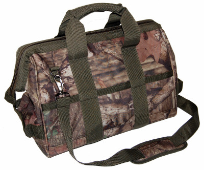 Bucket Boss, 16", Camo Gate Mouth Bag, Super Wide Doctor Bag Opening, 16 Pockets, 6 Exterior & 10 Interior, Mossy Oak Rip Stop 600D Poly, Reinforced, Padded Rip Stop Bottom, Removable Padded Shoulder Strap, Side Pull Handles, Dimensions: 16.5"W x 8.5"D x 10"H. vendor ID: 8234 Price/Unit: 49.99EA model: 85016