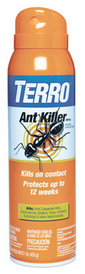 16 OZ, Aerosol, Terro Ant Killer Spray, Protects Up To 6 Weeks, Kills On Contact, Kills Carpenter Ants, Has No Unpleasant Odor, Is A Water Based, Non-Staining Formula. vendor ID: 81760 Price/Unit: 4.99FT model: T401-6