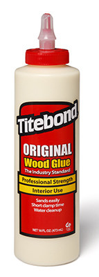 Titebond, 16 OZ, Original Wood Glue, The Industry Standard Of Aliphatic Resin Glue For Woodworking, Provides A Strong Initial Tack & Fast Set To Reduce Clamp Time, Develops A Bond Stronger Than The Wood Itself, Excellent Sandability & Is Unaffected By Finishes, Ideal For Wood, Hardboard, Particleboard, Leather, Cloth & Most Other Porous Materials, Easy To Use, Non-Toxic & Cleans Up With Water, Conforms To The Requirements Of ASTM D4236, VOC Compliant. vendor ID: 29876 Price/Unit: 5.49EA model: 5064