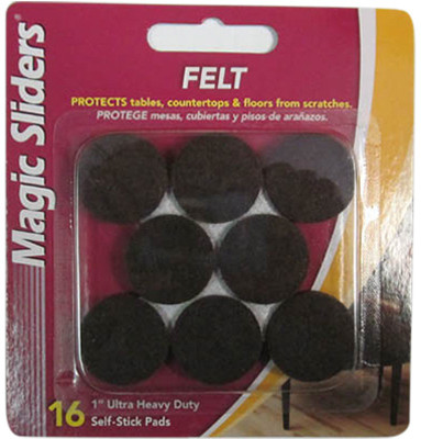 Magic Sliders, 16 Pack, 1", Brown, Round, Ultra Heavy Duty, Self Stick Felt Pad, Protects Floors, Tabletops & Drawers From Scratches. vendor ID: 52019 Price/Unit: 2.99EA model: 61414