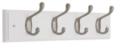 Essential, 18", Flat White, 4-Hook Rail With Satin Nickel Hook, 3.4"L x 18.75"W x 5.5"H, Traditional Style, Carded. vendor ID: 36665 Price/Unit: 17.99EA model: 160334