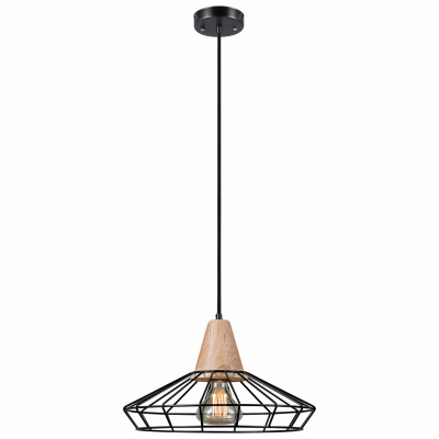 1 Light Cage Pendant, Black Finish, Wood Accent, Black Cloth Cord, Adjustable Hanging Cord, Allows You To Customize The Fixture To Your Lighting Needs & Desired Look, Fully Dimmable With Compatible Dimmer Switch To Create The Perfect Atmosphere, Includes All Mounting Hardware & A Canopy Mounting Plate For Quick & Easy Installation, Adds A Vintage/Industrial Feel To Any Space, Uses One 60W Maximum Medium Base Vintage Bulb, 15.35"W x 63"H, Not Included, cULus Listed. vendor ID: 3900 Price/Unit: 54.99EA model: 65492