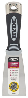 Hyde Pro, 2", Flexible, Stainless Steel, Putty Knife, 2" Flexible Blade, Use For Applying Compounds & Filling Holes & Cracks, High Carbon Stainless Steel Blade Is Tempered & Satin Finished, Solvent Resistant Nylon Handle. vendor ID: 38042 Price/Unit: 7.99EA model: 06228