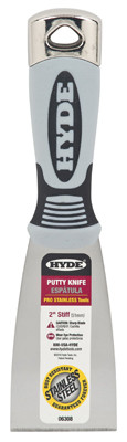 Hyde Pro, 2", Stiff, Stainless Steel, Putty Knife, 2" Stiff Blade, Use For Applying Compounds & Filling Holes & Cracks, High Carbon Stainless Steel Blade Is Tempered & Satin Finished, Solvent Resistant Nylon Handle. vendor ID: 38042 Price/Unit: 7.99EA model: 06308