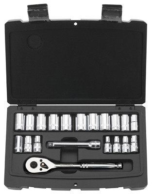 20 Piece, Socket Mechanic Tool Set, Includes: 18 - 1/4" Drive Sockets, One 3" 1/4" Extension Bar, One 1/4" Ratchet, Ratchet, Forged From High Quality Steel, High Polish Nickel Chrome, Ratchet Handles Are Ergonomically Designed & Have An Easy To Use Thumb Operated Reverse Switch Mechanism, Sockets & Extensions Remain Locked Onto The Drive Until Disengaged With An Easy To Reach, Low Profile Quick Release Button, Sockets Feature Max-Drive Design, Unique Radius Corner Design That Provides 15 Percent More Torque Than Standard Sockets To Tighten Fasteners Easily & Simplify The Turning Of Rounded Corners, Includes Blow Molded Carry Case. vendor ID: 2295 Price/Unit: 14.99EA model: 92-802