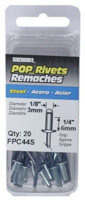 Surebonder, 20 Pack, Medium Steel Rivet, 1/8" Diameter, Grip Range: .188" - .250", Steel Mandrel. vendor ID: 36681 Price/Unit: 2.99EA model: FPC44S