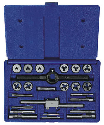 24 Piece, Metric Tap & Hex Die Set, Dies Are Ideal For Routine Maintenance, Repair Work & For Rethreading Where High Accuracy & Tolerance Thread Is Not Critical, Taps Have Straight Flutes Which Are Ground To Provide Rapid Chip Removal For Efficient Threading, Designed For Hand Threading Work In A Variety Of Materials Taps Produce A Class 2B Thread, Includes Metric 3 mm x 0.50, 4 mm x 0.70, 5 mm x 0.80, 6 mm x 1.00, 7 mm x 1.00, 8 mm x 1.25, 9 mm x 1.25, 10 mm x 1.50, 12 mm x 1.50, 12 mm x 1.7M Taps & Dies, Pipe 1/8" x 28 BSP Tap & Die, Plain Die Stock For 1" Dies, Offset Adjustable Tap Wrench For Taps #0 - 1/2". vendor ID: 2864 Price/Unit: 89.99EA model: 26313