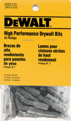 25 Pack, #2 Phillips Drywall Bit Tip, Shock Resistant Steel For Maximum Durability, Hardened Core For Extra Strength & Reduced Breakage, Heat Treated To Resist Breakage & Wear & Specially Designed To Reduce Stripping. vendor ID: 22426 Price/Unit: 14.99EA model: DW2125