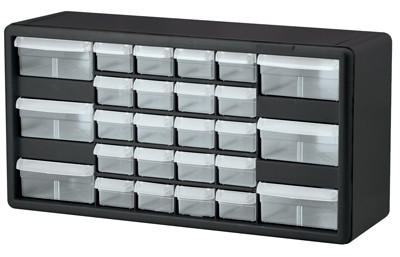 26 Drawer Cabinet, Rugged, High Impact Polystyrene Frame Resists Damage In Shipping & Storage, Frame Back Interlocks Into Face Of Cabinets To Endure Abuse & Extreme Temperatures, No Glued Backs To Fall Apart, Cabinets Stack Or Wall Mount, Dividers Not Included. vendor ID: 83 Price/Unit: 19.99EA model: 10726