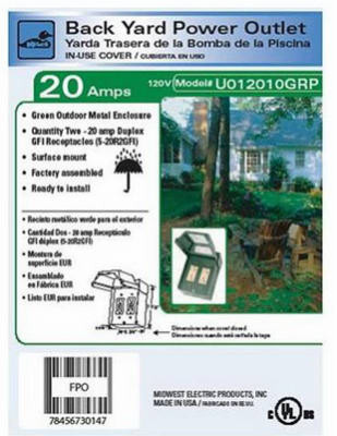 20A, 2 GFI Receptacle, Backyard Power Outlet, Green Outdoor Metal Enclosure With Two 20A Duplex GFI Receptacles #5-20R20GFI, Factory Assembled. vendor ID: 17657 Price/Unit: 69.99EA model: U012010GRP