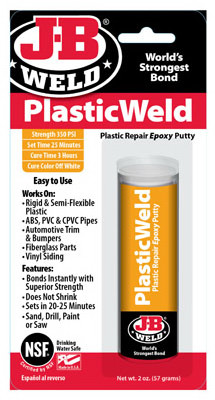 J-B Kwik Plastik, 2 OZ, Plastic Repair Epoxy Putty Stick, Repair & Rebuild Any Rigid & Semi-Flexible Plastic Including ABS, PVC & CPVC, Bonds Instantly, Superior Strength, Will Not Shrink Or Pull Away, Rebuild Automotive Trim, Fiberglass Parts & Vinyl Siding. vendor ID: 84830 Price/Unit: 6.29EA model: 8237