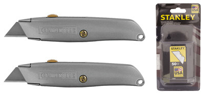 Stanley, 2 Piece, Utility Knife Set With 50 Pack Of Blades, Includes Two 6" Stanley 10-099 Classic Aluminum Retractable Utility Knives, 3 Position Blade, Blade Storage In Handle, With Stanley 11-921L 50 Pack Of Utility Knife Blades, Engineered For General Purpose Cutting, Precision Honed Edge For Consistent & Long Cutting Life, Length 2-7/16", Thickness .024", Fits Most Standard Utility Knives. vendor ID: 2295 Price/Unit: 9.97EA model: STHT74477