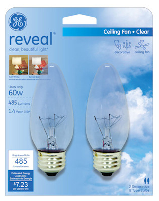 60BM/RVL CD2, 2 Pack, 60W,120V Reveal Clear Blunt Tip Decorative Bulb, Medium Base, MOL 4.625", 1500 Hour Life, Special Neodymium Glass Filters Out Yellow Light Spectrum Of Ordinary Incandescent Light Providing A Color Enhanced Full Spectrum Light Source, Carded. vendor ID: 18655 Price/Unit: 5.69EA model: 48713