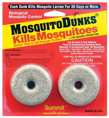 2 Pack, Mosquito Dunk, Biological Mosquito Control Kills MosquitoesBefore They're Old Enough To Bite, Easy To Use, Simply Place Mosquito Dunk In The Water Garden Or Any Standing Water, Keeps Working For 30 Days & More, Completely Degrades. vendor ID: 73619 Price/Unit: 5.99PKG model: 102-12
