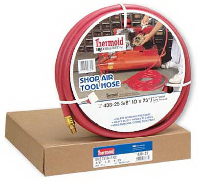 3/8" x 25', Red Rubber Air Hose, 2 Ply/4 Spiral Coupled, 250 PSI, High Tensile Reinforcing, Male Fittings At Both Ends. vendor ID: 60889 Price/Unit: 42.99EA model: 43825