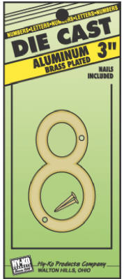 3", Brass Plated, Die Cast Number 8, Includes Mounting Nails. vendor ID: 49601 Price/Unit: 2.19EA model: DCG-3/8
