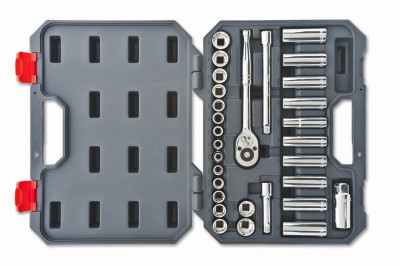 30 Piece, Crescent&tmreg. Brand, Professional Tool Set, All Tools Meet ANSI/ASME Specifications, High Impact Plastic Case, Wide Selection Of Standard & Deep Sockets In The Most Common SAE & Metric Sizes, Consists Of: 3/8" Drive, 72 Teeth Quick Release Ratchet Drive, 3" Extension, 6" Extension, 13/16" Spark Plug Socket, (16) 12 Point Sockets: 5/16", 3/8", 7/16", 1/2" 9/16", 5/8", 11/16", 3/4", 9MM, 10MM, 12MM, 13MM, 14MM, 15MM, 17MM, 19MM & (10) 12 Point Deep Well Sockets: 7/16", 1/2" 9/16", 5/8", 11/16", 12MM, 13MM, 14MM, 16MM, 17MM. vendor ID: 547 Price/Unit: 37.99EA model: CTK30SET