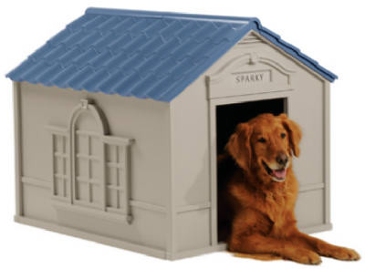 33"W x 38-1/2"D x 32"H, Large, Deluxe Dog House, For Dogs Up To 100 LB, Easy Snap Together Assembly, Durable Resin Construction, Vents Provide Air Circulation, Removable Roof For Easy Cleaning, Crowned Floor With Channel Around Inside Edge To Capture Fluids & Keep Pet Dry, Can Be Staked To Ground, Vinyl Doors Included & You Can Personalize House With Your Dogs Name Letters Included. vendor ID: 6072 Price/Unit: 115.00EA model: DH350