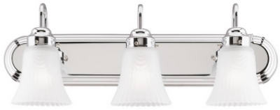 3 Light, Wall Mount, Light Fixture, Chrome Finish With Frosted Pleated Glass, Height 8-1/2", Width 24", Extends 7-1/4", Use 3 Standard Base, Soft White, A19, 100W Maximum Or Torpedo 60W Maximum. vendor ID: 39800 Price/Unit: 44.99EA model: 66522