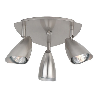 3 Light, Halogen Canopy Light, Triangle Shape Brushed Steel Slim Backplate Finish, Uses Three 50W Mr16 Gu10 Bulbs, Not Included, 13.75"W x 6.75"H, Dimmable, Fully Adjustable Head For Directing Light Where Needed, Mounting Hardware Included, Culus Listed. vendor ID: 3900 Price/Unit: 49.99EA model: 58929