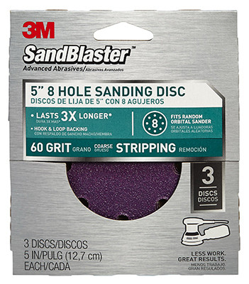 3M Sandblaster, 3 Pack, 5" 5-Hole 60 Grit Sanding Disc, Use On 5" Random Orbital Sanders Only, Use On Many Surfaces, Including Wood, Metal, & Fiberglass, Will Not Discolor Your Sanding Surface, Press Disc Firmly With A Slight Twisting Motion, Backing Is Coated With Extremely Durable Cubitron Mineral, Stays Sharp, Resulting In A More Consistent Sanded Surface & Longer Disc Life, Cuts 3 Times Faster & Lasts 3 Times Longer, Resists Tearing, Clog Resistant For Less Work. vendor ID: 14670 Price/Unit: 4.99EA model: 9421ES-30-B