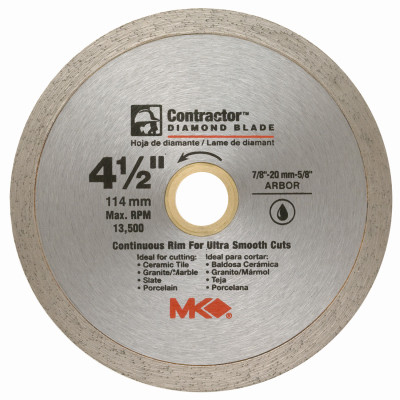 4-1/2", Contractor Continuous Rim Wet/Tile Saw Blade, 4-1/2" x 0.60" x 7/8" -20 mm- 5/8" Continuous Rim For Ultra Smooth Cuts, Cuts Ceramic Tile, Granite, Marble, Slate & Porcelain, These Diamond Blades Contain 10% More Diamond Than Standard Blades, Providing Long Life. vendor ID: 83758 Price/Unit: 12.99EA model: 167028