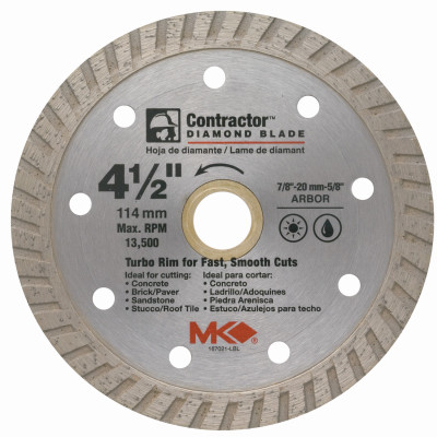 4-1/2" Turbo Rim Contractor Plus Dry/Wet Blade, Arbor 7/8"-20Mm-5/8" Turbo Rim For Fast Smooth Cuts, Cuts Concrete, Brick, Paver, Sandstone, Stucco & Roof Tile. vendor ID: 83758 Price/Unit: 49.99EA model: 166999