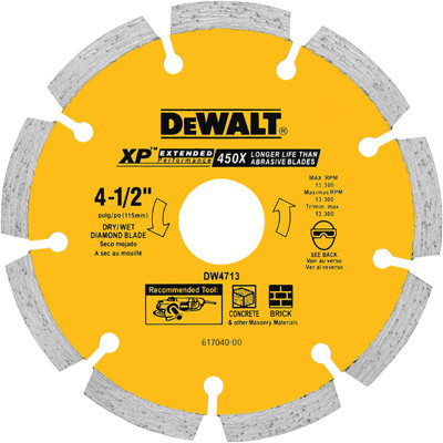 4.5", Dry Cutting, Segmented, Diamond Saw Blade With 5/8" - 7/8" Arbor, Extended Performance Diamond Matrix Provides 350 Times The Life Of Conventional Abrasives & Enhanced Material Cutting, Segmented Rim Blades Are Laser Welded With Heat Treated Steel Bodies Which Provides Increases Durability & Long Life, Large Diamond Segments With Cobalt Is Ideal For Use Across Various Product Applications, 080" Edge Thickness, For Cutting Brick, Block & Tile. vendor ID: 22426 Price/Unit: 26.99EA model: DW4713