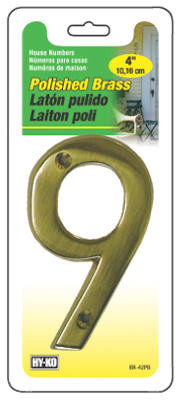 4", Solid Polished Brass, Prestige Series, House Number 9, Weather Resistant, Easily Screws Into Mounting Surface Mounting Screws Included Or Use With Hy Ko Prestige Series Plaques, Individually Packaged. vendor ID: 49601 Price/Unit: 5.79EA model: BR-42PB/9