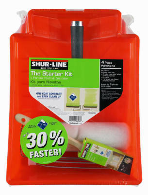 Shur-Line Paint + Primer, 4 Piece, Paint Project Tray Set, Includes: 9" x 3/8" Nap Roller Cover Designed For Use With All Paints On Semi-Smooth Surfaces Such As Walls & Ceilings, 9" Roller Frame, Deep Well Paint Tray & 1.5" Angle Brush Specially Designed For Sharp Edges & Cutting In To Small Spaces. vendor ID: 51128 Price/Unit: 9.99EA model: 8108RFN