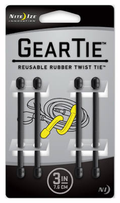 4 Pack, 3", Black, Gear Tie, With A Fully Bendable Wire Interior & Colorful, Durable, Soft Rubber Exterior, Perfect All Around Organizer, Keep Computer Cords, Headphones & Ear Buds Bundled & Untangled, Close Produce, Snack & Goody Bags, Shore Up Plant & Flower Stems & Much, Much More, All With A Simple Twist. vendor ID: 54783 Price/Unit: 3.99EA model: GT3-4PK-01